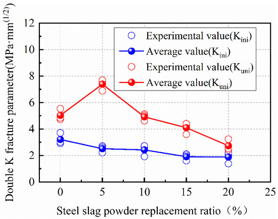Double-K fracture parameters of concrete with different steel-slag-powder replacement ratios.