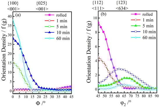 The texture type and intensity reflect the softening state of copper foil. Figure 7 shows the orientation distribution function (ODF) diagram of the rolled and annealed copper foil. Figure 8 represents texture orientation density along α (0°→90°, 45°, 0°), β (73°, 35°, 45°→90°) and (0°, 0°→45°, 0°) orientation lines, in which, φ1 is the angle between the intersection of RD-TD plane and [100]-[010] plane and RD orientation, Φ is the angle between RD-TD plane and [100]-[010] plane, and φ2 is the angle between the intersection of RD-TD plane and [100]-[010] plane and [100] orientation. This [100] orientation-[010] orientation-[001] orientation is the crystal coordinate system. From Figure 7a and Figure 8b,d, it can be concluded that the textures of rolled copper foil are copper texture ({112} <111>), brass texture ({110} <211>), S texture ({123} <634>), Gauss texture ({110} <100>), which are typical deformed textures [19], and the maximum texture intensity is 14.0. After annealing for 1 min, the main texture is still deformation texture. Meanwhile, a small amount of cube textures ({100} <001>) and ({025} <001>) begin to appear, which are annealing textures [20]. With the increase in annealing time, the annealing texture intensity increases obviously, and the annealing texture strength reaches 38.0 after annealing for 60 min. Softened annealing will obviously weaken the deformation texture intensity, while significantly enhancing the recrystallization texture intensity.