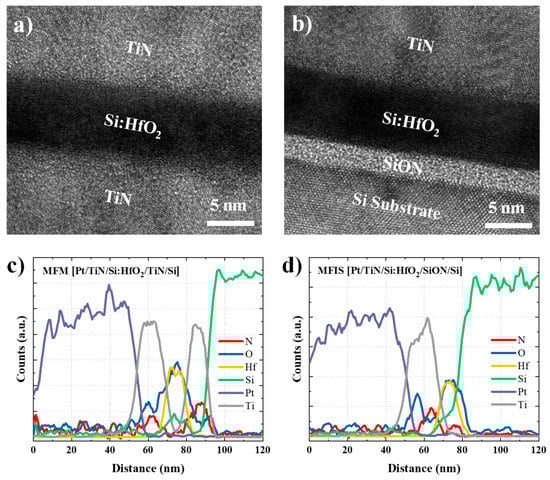 Figure 1a,b show transmission electron microscopy (TEM) bright field images of the FTJ devices with MFM (TiN/HSO/TiN) and MFIS (TiN/HSO/SiON/Si) structures, respectively. It can be seen that HSO for non-volatile memory performance was deposited to a thickness of 8 nm, and SiON for asymmetric potential barrier formation was deposited to a thickness of 25 Å. Figure 1c,d show the elemental depth profiles of the TiN/HSO/TiN and TiN/HSO/SiON/Si stacks, respectively, obtained using energy dispersive spectroscopy (EDS). Because the upper stacks of the MFM and MFIS structures are identical, the depth profiles of the Pt/TiN/HSO stacks are similar. In the case of the lower stacks, the Ti and N peaks are visible under the HSO thin film in the MFM structure, whereas the Si and N peaks are increased for the MFIS structure. The TEM images and EDS element depth profiles verify that the MFM and MFIS structures are well implemented. An asymmetric electrode structure using a heavily doped n-type Si substrate and a SiON insulator was designed to maximize the TER effect by using the asymmetry of the potential barrier formed in the MFIS structure.