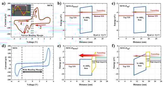 The current–voltage characteristics of (a) MFM and (d) MFIS FTJ devices measured using a triangular waveform; energy band diagrams for polarization directions of down and up in the (b,c) MFM structure and (e,f) MFIS structure.