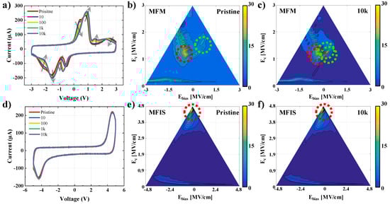 A comparison of the stability of the MFM and MFIS FTJ devices under electrical switching cycling: current–voltage curves of (a) MFM and (d) MFIS FTJ devices with an increase in the number of cycles; switching density pseudo-color plots (b), (e) in the pristine state, and (c), (f) after 10 k switching cycles. The scale bar to the right of the graph represents the switching density, ρ.