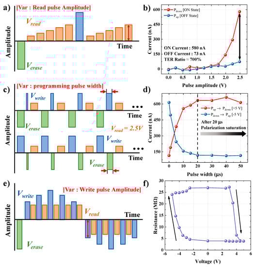 In Figure 4, the analysis of the pulse driving conditions applicable to read and write driving for the memory operation of the FTJ device is performed. Figure 4a shows the pulse scheme used to determine the read operation. Before the read pulse, the polarization is aligned upward and downward to investigate the difference in the tunneling current. An amplitude of ±5 V and a pulse of 50 µs were used to ensure sufficient alignment of the polarization in one direction. Then, the tunneling current was measured by applying pulses from 0 V to 2.5 V at 0.5 V steps. In addition, to observe the dependence of the tunneling current on the change in amplitude, the pulse width was fixed at 100 μs. Figure 4b shows the read current as a function of the applied voltage. Below 1.75 V, there is no significant current difference between the upward and downward polarizations. However, the current difference begins to occur from 2 V, and the largest TER ratio occurs at 2.5 V. The MFIS FTJ device shows tunneling currents of 580 nA in the ON state and 73 nA in the OFF state, resulting in a TER value of 700%. This tunneling current difference is similar to that predicted by analyzing the energy band diagram shown in Figure 2. Figure 4c shows the pulse scheme used to optimize the pulse width for the writing (top) and erasing (bottom) operation. The pulse amplitude was fixed at 5 V (writing) and −5 V (erasing), and the tunneling current was measured using a read voltage pulse after each programming (write or erase) with pulses 1–50 µs in pulse width. In the Figure 4d, the red data is the measured tunneling current along the width of the write programming pulse (Figure 4c top), and the blue data is the measured tunneling current while adjusting the width of the erase programming pulse (Figure 4c bottom). Regardless of the polarization direction, the tunneling current initially increases as the pulse width increases and then saturates at 20 µs (Figure 4d). Thus, we can determine that the FTJ device completes the barrier modulation at a pulse width of 20 µs. The use of a write pulse of ±2.5–5 V, 20 µs and a read pulse of 2.5 V, 100 µs was validated by the experimental results as the driving conditions for obtaining the optimal TER effect. A resistance–voltage (R-V) hysteresis loop was investigated using the optimized pulse driving conditions. Figure 4e shows the pulse scheme used to obtain the R–V hysteresis data. The tunneling current, measured as the write pulse, was increased from 0 V → 2.5 V → 5 V and decreased from 5 V → 2.5 V → 0 V → −2.5 V → −5 V. When the negative saturation amplitude was reached, it was increased again to 0 V. The resistance was measured with increasing increments of 0.5 V from 2.5 V, at which polarization switching started. As shown in the R–V hysteresis loop in Figure 4f, resistance switching is observed after 3 V. As the amplitude reaches 3 V, barrier modulation occurs through polarization reversal from the OFF state to the ON state, or vice versa. Finally, resistance switching due to the polarization is complete at ±5 V. Furthermore, in saturation resistance, when an amplitude less than the programmed amplitude is applied, the resistance does not change until the opposite threshold voltage is reached. Therefore, it can be seen that the MFIS FTJ device has excellent memory characteristics that can clearly distinguish the ON/OFF ratio by controlling the polarization reversal with pulse driving.
