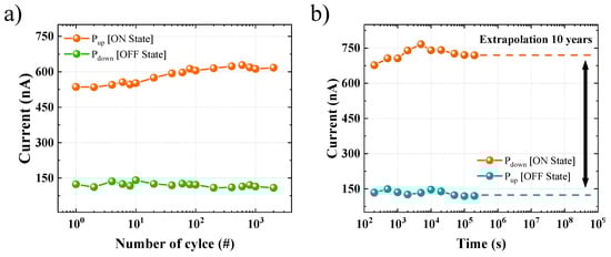 Endurance and retention tests were performed to evaluate the reliability of the memory characteristics of the previously analyzed FTJ device. Figure 5a shows the endurance properties evaluated by repeated ferroelectric polarization reversal through electric field cycling. The memory characteristics in the pristine state, with a tunneling current difference of approximately four times, are maintained during 2 × 103 electric field cycles. However, the ON/OFF current ratio increases as the current value in the ON state gradually increases during electric field cycling. This can be caused by the formation of leakage current paths due to the rearrangement or creation of defects, such as oxygen vacancies in the ferroelectric film during electrical cycling. In order to secure the reliability of the device, there is a need to continue efforts to minimize the electrical degradation characteristics due to the fatigue phenomenon of the thin film. Nevertheless, the FTJ device still has a wide memory window. Figure 5b shows the retention characteristics to demonstrate the non-volatility of the device. In both the ON and OFF states, the current decay phenomenon in which the non-volatile characteristics disappear is not observed before 105 s, demonstrating that the device has excellent non-volatile characteristics. The extrapolation of this analysis makes it possible to predict that the programmed memory will be maintained for approximately 10 years.