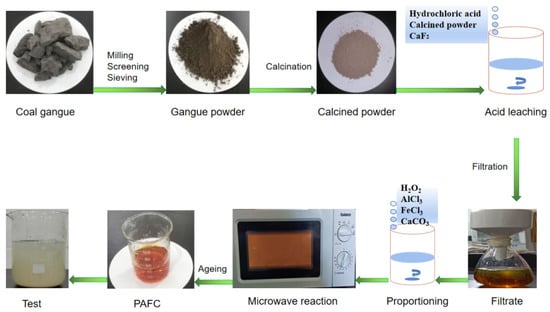 The gangue sample comes from a coal mine in Liupanshui City. Thirty percent H2O2, CaF2, and CaCO3 are the analytical purity reagents from Tianjin City Zhiyuan Chemical Co., Ltd. Tianjin, China. Hydrochloric acid is an analytical purity reagent from Chongqing Chuandong Chemical Co., Ltd. Chongqing, China. Polymeric aluminum chloride (PAC), polymeric iron chloride (PAF), and kaolinite are bought from the market, they are chemically pure reagents.