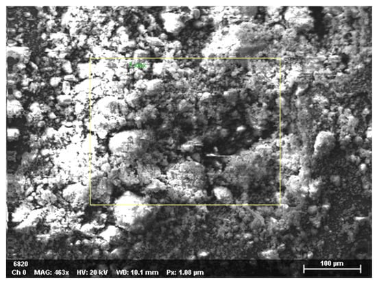 From Figure 3, it can be seen that the crushed raw coal gangue particles have an irregular shape, the smallest particle diameter is about 1 micron, the larger particles are about tens of microns, and there is an agglomeration phenomenon; the smaller particles are conducive to the acid leaching reaction. To understand the elements inside the mineral, a region within the yellow box as shown in Figure 4 is selected for energy spectrum analysis; the results are shown in Figure 5.