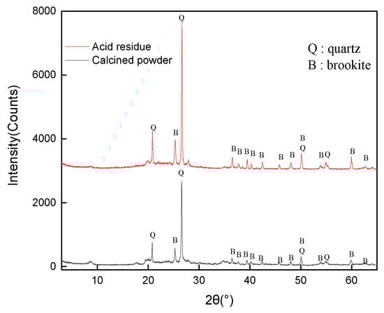 The diffraction peak shapes of the filter residue after acid leaching are similar to those before acid leaching, but their intensities are different because quartz and brookite cannot react with dilute hydrochloric acid, and after acid leaching, the dissolution of the aluminum and iron ions causes the relative content of the remaining material to rise, so their diffraction intensities are enhanced.