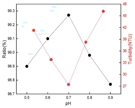 Figure 7 shows that with the increase of pH, the turbidity removal ratio first increases and then decreases. The maximum turbidity removal ratio is 99.26% at pH = 0.7. Because the pH will affect the degree of hydrolysis of aluminum and iron ions, appropriate pH can promote hydrolysis, generate various hydroxyl aluminum ions and hydroxyl iron ions, and promote the polymerization reaction, the main reactions of the process are as follows [48]: