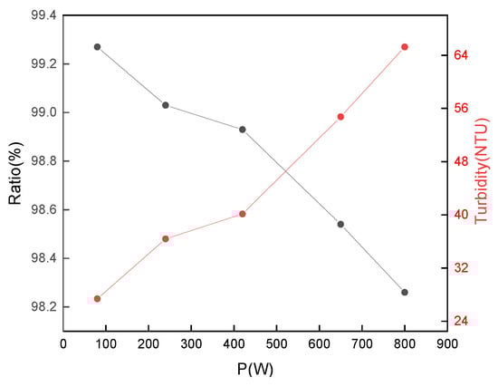 As can be seen from Figure 8, the turbidity removal ratio with the increase in power and a decreasing trend, microwave power is 80 W suitable for the highest turbidity removal ratio. As the power determines the polymerization temperature of the product, the power is larger and the temperature of the reaction system is higher [49], which will lead to the system of aluminum and iron ions in violent hydrolysis, thus producing aluminum hydroxide, iron hydroxide, and other precipitation;, aluminum and iron ions cannot be well polymerized, so the product turbidity removal performance is poor and the choice power is 80 W.