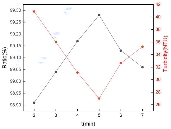 As can be seen from Figure 9, the turbidity removal ratio of the product gradually increases with the increase of the reaction time from 1 to 5 min, and is highest when the reaction time is 5 min. Because the hydrolysis absorbs heat, the temperature of the system at the beginning of the reaction is low, the degree of hydrolysis reaction is low, and the degree of polymerization of the product is not high at this time. As time increases, the temperature gradually increases [50], the hydrolysis gradually deepens, hydroxide ions gradually replace the chloride ions, promoting the polymerization reaction, while the resulting polymer also has a strong ability to absorb microwaves, which accelerates the polymerization reaction [51], so the degree of polymerization of the product correspondingly increases, and the product of the turbidity performance is also improved. Continue to increase the radiation time, the product of the turbidity ratio gradually decreased, due to the length of time taken to make the polymerization of the product too high or even to generate a high degree of polymerization of hydroxyl complexes, resulting in the product of the turbidity performance decline, so the appropriate time is 5 min.