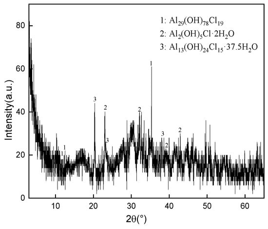 As can be seen from Figure 10, the diffraction peaks of the product are very low in intensity, no strong diffraction peaks of aluminum and iron chloride appear, the main body is diffuse and the spectrum has a high back-bottom, which indicates that the aluminum and iron chloride in the filtrate have polymerized. The diffraction peaks are not high in intensity, indicating that they are predominantly amorphous. Several crystalline polymers of aluminum and iron also appear, e.g., Al29(OH)78Cl19, Al2(OH)5Cl·2H2O, and Al13(OH)24Cl15·37.5H2O, but the intensity of the diffraction peaks is low. The difficulty in finding peaks for the iron polymers in Figure 10 suggests that the iron polymers are in an amorphous form, suggesting that the product is a mixture of PAFCs with varying degrees of polymerization. Diffraction peaks of unknown substances also appear in the figure, which is a good indication of the complexity of the composition.