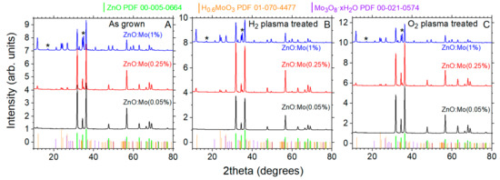 Figure 1B,C. The analysis of these patterns led to the conclusion that the plasma treatments caused no, or negligibly small, changes to the material phases of the ZnO:Mo(0.25 and 1%) samples, i.e., the unintentional phases as well as the ZnO phase underwent almost no changes. In contrast, the H