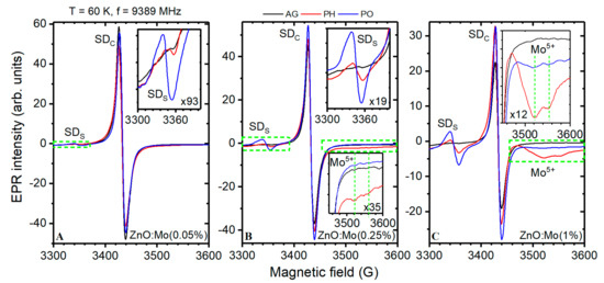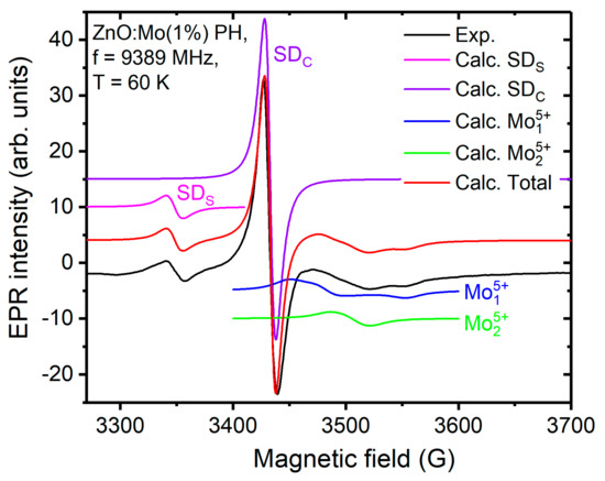 40] have previously been detected in undoped ZnO. Moreover, the EPR signal at g = 2.0038 was also measured in the room-temperature X-ray-irradiated ZnO:Mo(0.05, 0.25 and 1%) nanorods [