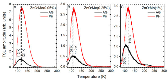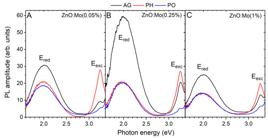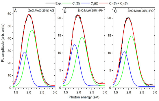 Figure 8A,B). This effect can be explained by the fact that the bandgap of the ZnO:Mo(0.05 and 0.25%) samples is wider due to the smaller number of Mo states contributing to the bandgap, whereas in the ZnO:Mo(1%), the donor states created by Mo are more dense, therefore the bottom of the conduction band must be lower. Note, that the excited state of the zinc vacancy-based defects are expected to appear at about 0.5 eV above the bottom of the conduction band [