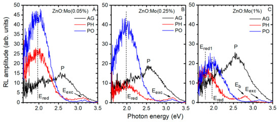 The RL spectrum is broad and complex for the as-grown ZnO:Mo(0.05, 0.25, 1%) samples, which were not exposed to any treatment. The clearly visible maximum is observed at approximately 2.58 eV (P band in