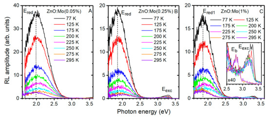 red1 band appearance). Therefore, to find out the peculiarities of the RL spectra upon cooling, the hydrogen plasma-treated ZnO:Mo(0.05, 0.25, 1%) samples were chosen (see