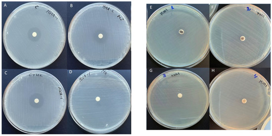 Bacteria were suspended with a sterile swab in 2 mL of saline solution and adjusted to a turbidity of 0.5 on the McFarland scale (equivalent to 1 × 108–2 × 108 CFU/mL of E. coli) [19]. Subsequently, the bacteria were seeded following the MHA plate seeding method. The discs impregnated with 20 µL of each corresponding antibiotic solution were then deposited. Table 3 specifies the tests performed in this study.