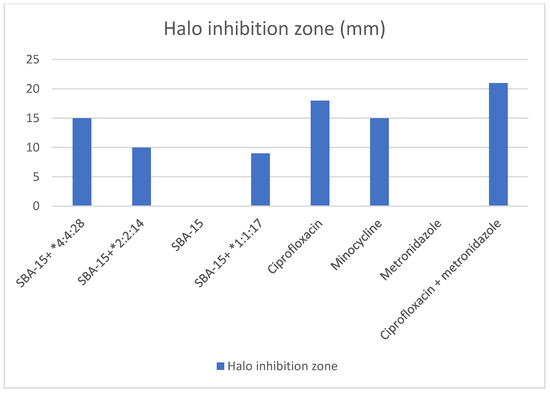 The antibacterial activity has been assessed with halo diameter inhibition and is summarized in Figure 1. The greatest antibacterial effectiveness was demonstrated by the combination of ciprofloxacin with metronidazole (p < 0.005), observing an inhibitory zone of 21 mm (Figure 2). Plates containing exclusively SBA-15 (with a concentration of 100 mg/L) and the metronidazole plate (with a concentration of 500 mg/L) had no antimicrobial effect. All the other tested solutions resulted in some degree of inhibitory effect (Figure 1).