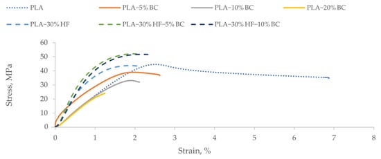 Figure 2 provides the stress-strain curves related to tensile testing of PLA-based composites, and Table 4 gathers the obtained tensile properties.