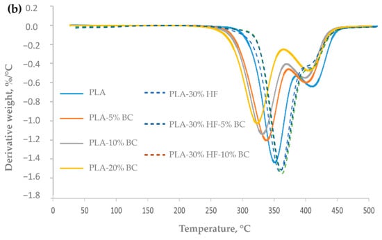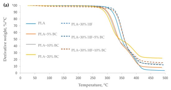 The addition of 30% hemp fibers to the PLA matrix shifted the thermal decomposition of the hemp-PLA composites to higher temperatures compared to the neat PLA. Hemp fibers are mainly composed of cellulose, moreover hemicellulose, lignin, soluble and organic matter [] that have different thermal resistances. Lignin is reported to slowly decompose from ambient temperature to 900 °C [], followed by the decomposition of hemicellulose occurring between 220 °C and 315 °C [], and the decomposition of cellulose between 315 °C and 400 °C []. Thus, the improvement in thermal resistance is due to the high cellulose content in hemp fibers. Indeed, Marrot et al. [] reported a 77–80% w/rw cellulose of the dry material. Thus, the improvement in thermal resistance is due to the high cellulose content in hemp fibers, which decomposition temperature range is higher than the PLA’s one. The high standard deviations found for PLA-30% HF (for T5% and T10%) indicate a non-uniform dispersion of the fibers during the preparation process. Upon incorporation of 5 wt% BC in the hemp-PLA composites, T5% and T10% increased by 4.4 °C and 2 °C, respectively, indicating an enhancement in the thermal resistance. However, a further increase in BC content to 10 wt% resulted in a slight decrease of the degradation temperature points.