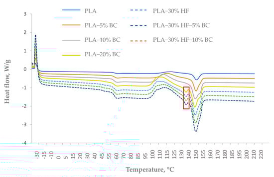 The broad exothermic peak after the Tg corresponds to cold crystallization phenomena. For neat PLA, the cold crystallization peak was very low. However, for the other composites, the corresponding peaks were more visible. In the case of PLA-BC composites, a visible decrease in Tcc was correlated with the increasing BC loadings. Arrigo et al. [] reported similar findings and stated that the BC filler enhanced the degradation of PLA molecules. As a result, the molecular mass of the molecules was lowered, and they became more mobile which favored the appearance of cold crystallization peaks at lower temperatures. The same trend was observed for the addition of BC in hemp-PLA composites, but results were less marked since the addition of hemp fibers counterbalanced this effect by slightly increasing the Tcc.