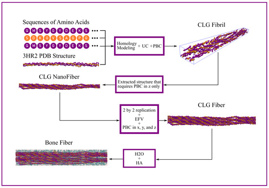 First, starting from the sequence of amino acids and an available fibrillar structure, the CLG Fibril model was devised through homology modeling. Then, a structure of the CLG fibril that requires Periodic Boundary Conditions (PBCs) only along the z direction was extracted and labeled CLG NanoFiber. When the latter is replicated along the x and y directions, surrounded by an EFV, and subjected to PBCs in the x, y, and z directions, the newly devised model is labeled CLG Fiber. Finally, adding and HA both in the EFV and IFV of the CLG Fiber gives origin to the Bone Fiber model. See Figure 2 for a schematic view of this modeling process, described in detail throughout this section.