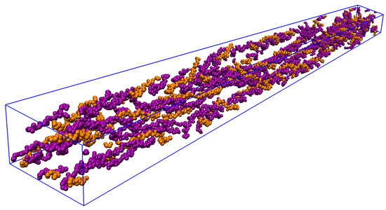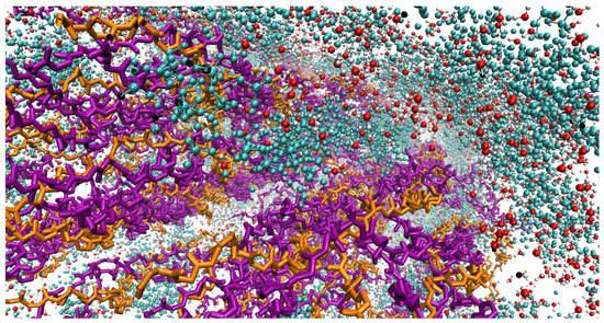 In all devised models, the total number of HA molecules was added to the simulation box such that 80% belong to the EFV, and only 20% to the IFV, as Refs. [18,19,20,21,22,23] point out. Packmol allows the creation of different geometries, including parallelepiped, sphere, cylinder, and other geometric shapes within which the new molecules will be inserted. The IFV was defined as a parallelepiped region within the larger simulation box, where CLG fibrils are mostly inside.