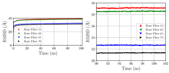 Several works performing molecular dynamics (MD) simulations of the bone structure have tried to comply with these two points, as shown by recent reviews [2,3,5]. Especially after Ref. [6] made available the first fibrillar structure of type I collagen, i.e., the structure of bone at the sub-nanoscale [2], MD simulations were carried out to study the heterogeneous nature of collagen [7,8], the orientation and chemical processes of its structure [9,10], and its mechanical properties [11]. Subsequently, hydroxyapatite crystals were included in the models based on the fibrillar structure provided by Ref. [6] for further investigations, especially for the mechanical properties [12,13,14,15,16,17]. To date, hydroxyapatite has been included solely within fibrils, in the intra-fibrillar volume (IFV). Yet, as several experiments have shown, higher concentrations of hydroxyapatite are indeed found surrounding the fibrils in the extra-fibrillar volume (EFV) [18,19,20,21,22,23], which is also labeled as the extra-fibrillar matrix.