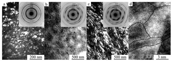 After HPT at a pressure of 5 GPa and five revolutions, similar TEM images of the nanostructured state of the alloy were observed. However, SAED patterns had fundamentally changed (inserts in Figure 4b,c). According to the results of their indexing, in accordance with the XRD analysis (Figure 1e,f) the alloy has a structure of γ-FCC up to 120 K (of type A1: with hkl indices 111, 200, 220, 311, etc.). It can be assumed that the amorphous component detected due to continuous diffuse halos (inserts in Figure 4a–c) was localized on the blurred, sinuous intercrystalline interfaces of γ nanocrystals clearly visualized in direct atomic resolution images (Figure 4d). It is along these that the bending contours of extinction were localized in TEM images.