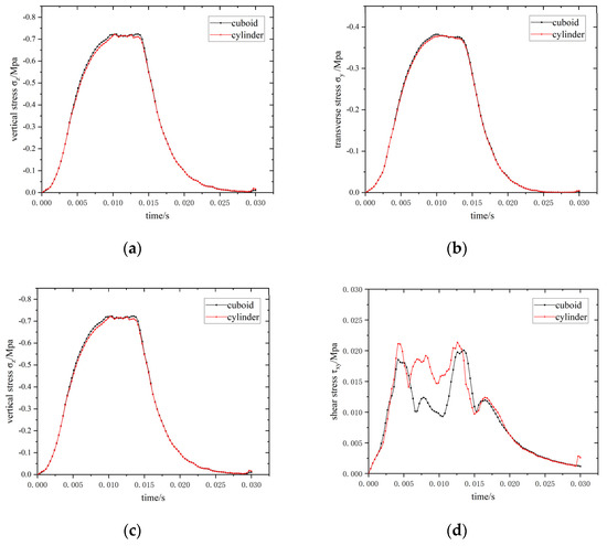 Maximum stress–time curves of elements at the interface. (a) Longitudinal stress (σx); (b) transverse stress (σy); (c) vertical stress (σz); (d) shear stress (τxy); (e) shear stress (τxz); (f) shear stress (τyz).