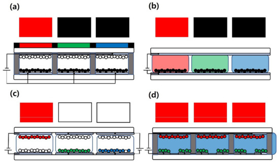 The multi-electrode type electronic paper has a structure in which one common electrode is placed on an upper substrate, and three electrodes are spaced apart from each other on a lower substrate in a unit cell. Figure 5a shows the three-dimensional structure of the proposed panel, in which a glass substrate coated with an ITO electrode was placed on an upper substrate. These structures are applicable for both reflective and transparent types, such as shown in Figure 5b,c. In these structures, the color of the reflective type could be expressed by the color of particles that stick to the upper electrode. Meanwhile, the color for the transparent type could be expressed by the areal density of the particles on the bottom electrode. The areal density was determined by the deployment of the particles that varies from the positive–positive–positive (PPP) voltage on three of the bottom electrodes to negative–negative–negative (NNN) voltage.