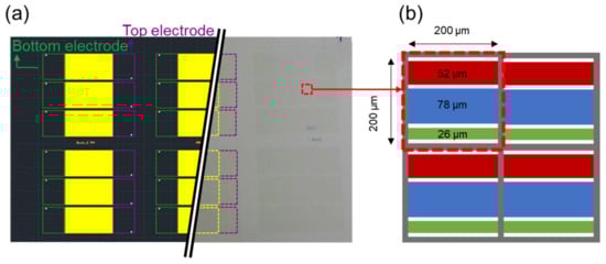 The multi-electrode type E-paper has a structure in which three electrodes are located in one cell-one common electrode on the upper substrate and three electrodes spaced on the lower substrate, as seen in Figure 2 in detail. The three electrodes at the bottom have different sizes of 26, 52, and 78 μm, respectively. The each of bottom electrodes was designed to have a different surface area, and the diverse cover area can be acquired by the combination of these three electrodes. By controlling the voltage on the electrodes, the aperture ratio can be controlled by arranging the nanoparticle ink. In addition, the thickness of the lower electrode is about 1 μm. The panel was made with a 30 mm × 30 mm board with a Lab scale, and the number of cells is 120 × 120. The three electrodes on the lower substrate were patterned and fabricated by photolithography. Various materials such as glass and film can be used for the lower substrate, but the glass substrate was used for the convenience of the experiment. The lower substrate was manufactured by applying a photolithography process, and the cell was formed by placing the partition pattern with SU-8 photoresist on the electrode pattern. The fabricated device has a cell size of 200 μm × 200 μm, a cell height of 23.4 μm, and an electrode width of 26.0 μm.