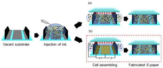 Fabrication procedures for loading methods of the E-ink with (a) conventional method and (b) electrophoretic particle load method.
