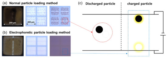 Optical microscopy images for E-paper fabricated by (a) conventional particle loading method and (b) electrophoretic particle loading method. (c) Schematic illustration for comparison of discharged and charged particles in the cell.