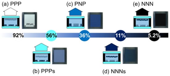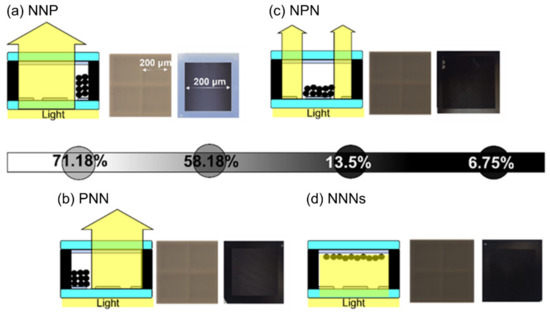 Schematic illustrations for the arrangement of the particles controlled by the voltage application and their transmittance from 6.8% to 71% in transmissive type E-paper with (a) NNP, (b) PNN, (c) NPN, and (d) NNNs bias.