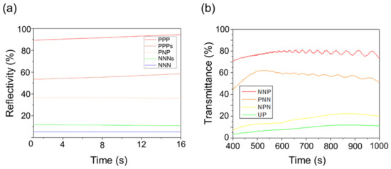 Figure 7 shows the state in which the transmittance is controlled by driving the sample. The left side of each figure is a schematic diagram, the center one is a microscopic observation, and the right one is visual observation. In Figure 7a, the transmittance is measured to be 71.18% with + voltage applied only to the 3rd electrode, which is the narrowest with an area of 20 μm (NNP), and the transmittance is enough to see the opposite side. Figure 7b shows that the sample is driven by applying a positive voltage only to electrode 1 with an area of 45 μm (PNN). Figure 7c shows a sample in which positive voltage was applied (NPN) only to electrode 2 (the largest of the three electrodes) with an area of 80 μm. Black particles were placed only in the middle of the lower substrate, and the upper substrate, compared with Figure 7d, was slightly transparent. Figure 7d confirms that the opposite side cannot be observed from the upper substrate because there were black particles on the upper substrate in a state where the negative voltage was applied to all three electrodes (NNN). This figure shows an example of the above-mentioned transmittance of 6.75%, which was at a level where the opposite side was hardly reflected. Another example exhibited 13.5% of the transmittance, and the opposite side was slightly reflected. The results showed that more varied transmittance control was possible by increasing the particle driving method and the number of lower electrodes. It resulted from the distribution of black particles located on the lower substrate. The aperture ratio of the film was determined by the distribution of black particles on the lower substrate, and the transmittance was determined by the aperture ratio. The area of each electrode was different by the bottom electrode designed with different sizes. Figure 8 shows a graph of the color reflectance and transmittance.