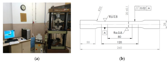 The uniaxial tensile test: Testing machine TIRAtest 2300 (a); Specimen dimensions for the test (mm) (b).