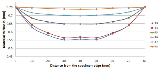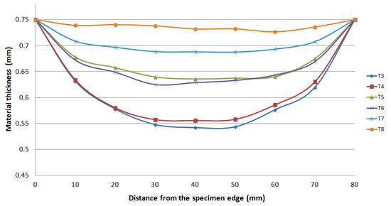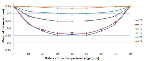 The thickness results of the specimen are presented in Figure 8 and Figure 9 after bulge testing, which were measured using the digital point micrometer. The values calculated by ARGUS optical measuring system using GOM Inspect software are presented in Figure 10. Thinning maps of T3 and T6 samples are presented in Figure 11 and Figure 12. The estimated thicknesses using GOM Inspect software show some asymmetry. The asymmetry may be caused by various factors, such as the accuracy of the measuring equipment, insufficient quality of the tested surface, inappropriate quality of the etched deformation net, imperfect lighting conditions during scanning of the deformation net, and the grid points interpolation.