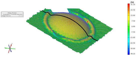 During bulge testing, the points of the deformation grid on the sample in the deformation areas shifted. The diameter of one grid point was 1 mm and the distance between points was 2 mm. The images of the samples were taken using a digital camera Schneider KREUZNACH CINEGON 1.4/12 (Schneider Optische Werke GmbH, Bad Kreuznach, Germany). Taken images were processed using GOM Inspect software (GOM GmbH, GOM Inspect 2012, Braunschweig, Germany) and the thickness of the bulge test samples was evaluated (Figure 4).