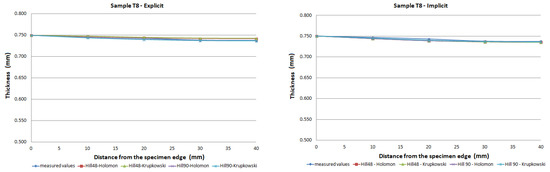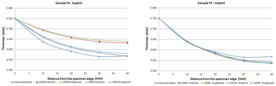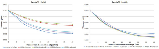The FE analysis aimed to analyze the thickness differences caused by changing hardening models and yield criteria in simulation. Additionally, the impact of the integration scheme (implicit/explicit) was evaluated. The comparison of predicted thickness values of samples T3 and T6 using software with explicit solver are presented in Figure 13. The simulation results are presented using graphs in Figure 14, Figure 15, Figure 16, Figure 17, Figure 18 and Figure 19.