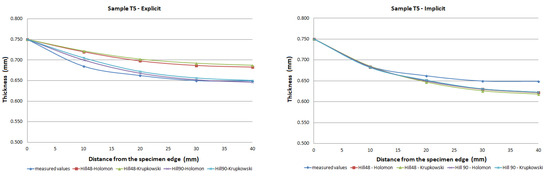 The predicted thickness of the formed part showed the best correlation with measured thickness values when the Hill90 yield surface model combined with the Hollomon hardening model was used in simulation software with the explicit solver. The combination of the Hill90 yield surface model and Krupkowski hardening model showed the best correlation of thickness results when simulation software using implicit solver was used. Overall, smaller deviations of predicted thickness were observed for samples with lower deformation, lower dome height (samples T7, T8) and higher deviations of thickness were observed in samples with greater deformation, higher dome height (samples T3, T4). The results obtained using software with implicit solver showed a better correlation with experimental thickness results than results obtained using the software with explicit solver.