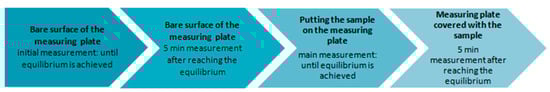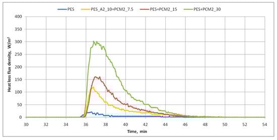 Table 5), because under isothermal conditions, both these quantities are the same. The increase in heating power resulted from the operation of the device’s control system, which constantly aims to maintain the temperature of the measuring plate at a constant level of 35 °C. In the case of the aforementioned PES + PCM2_30 insert, after its application, the deviation from the average surface temperature of the measuring plate before the application was the largest and amounted to 1.5 °C, while in the case of the PES reference insert, this difference was only 0.3 °C. This result indicates that the developed PCM nonwoven insert should effectively cool the body of the clothing user during temporary changes in ambient temperature or a short-term increase in physical activity. The use of a twice smaller mass of PCM microcapsules compared to the PES + PCM2_30 insert, i.e., 15 g, resulted in a similar reduction in the temperature of the measuring plate, i.e., by 1.4 °C, but at the same time, there was a 46% decrease in the maximum value of the heat flux density in relation to the insert with 30 g PCMs (from 300.8 to 160.6 W·m