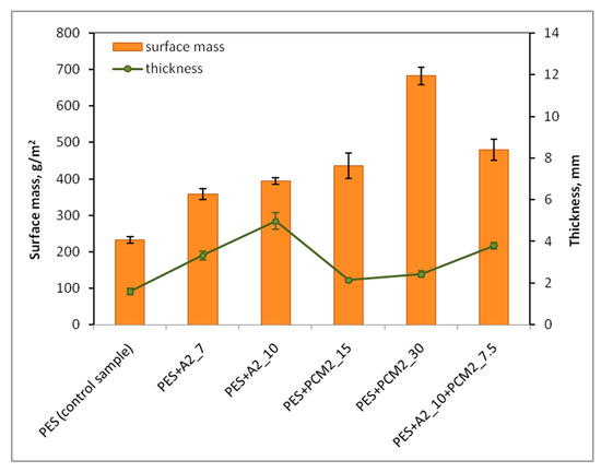 The thickness of the insert containing 30 g of PCM microcapsules (PES + PCM2_30) was 2.42 ± 0.16 mm and was more than 50% less than the thickness of the insert containing 10 g of aerogel (PES + A2_10), but at the same time, this insert had a much greater surface mass (by 73%). Due to the high content of PCM, this insert can be very effective in terms of temperature control in the sub-clothing microclimate, but due to its weight it can be difficult to accept for users.