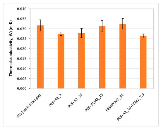 Figure 5. The insert without additives (PES), together with the inserts with PCM addition, showed the highest thermal conductivity (above 0.030 W·m