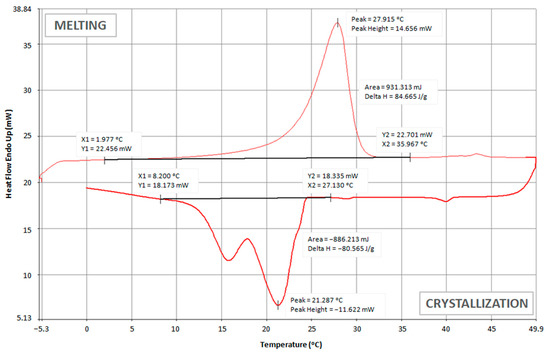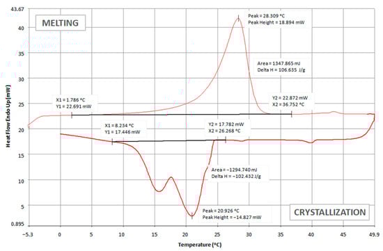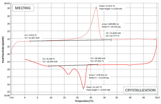 Figure 8). This is logical since the melting process of the PCMs took longer due to the greater amount of PCMs and thus the greater thickness of this layer. During the cooling process of the tested inserts, two crystallization peaks were recorded—the first at a temperature of approximately (20.9–22.3) °C, and the second at a temperature of (15.7–16.5) °C.