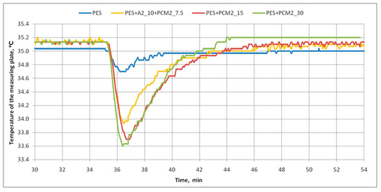 The above graphs prove that there are clear differences in the response of the thermal simulator, i.e., the skin model, depending on the tested inserted variant. In all cases, after the samples were applied, a significant decrease in the surface temperature of the measuring plate of the skin model was noted below the set value, i.e., 35 °C. It was found that the cooling efficiency of the measuring plate by the nonwoven inserts increased with increasing PCM microcapsule content in the insert. The insert with the highest PCM content, i.e., PES + PCM2_30, had the greatest impact on lowering the temperature of the measuring plate (