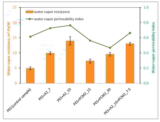 Figure 11 clearly shows that all aerogel inserts have a better water vapor permeability index (0.67–0.77), not only compared to the reference PES insert (0.62), but also inserts only containing PCM microcapsules (0.47–0.57). Particularly noteworthy are the PES + PCM2_30 and PES + A2_7 inserts, which, despite a similar value of water vapor resistance (approximately 9.55–9.92 m