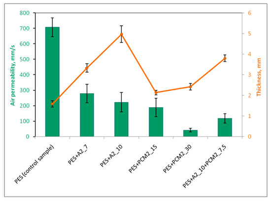 The values of air permeability of the PES + A2_7 and PES + A2_10 inserts significantly exceed the minimum value of air permeability (i.e., 100 mm · s