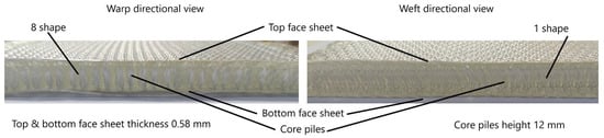 - Zhang, M.; Wang, X.; Liu, S.; Li, F.; Wu, G. Effects of Face Sheet Structure on Mechanical Properties of 3D Integrated Woven Spacer Composites. Fibers Polym. 2020, 21, 1594–1604. [Google Scholar] [CrossRef]