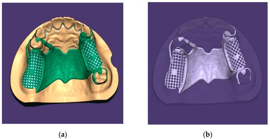 (a) Virtual waxing of the removable partial denture framework; (b) framework ready to export and three-dimensional printing.