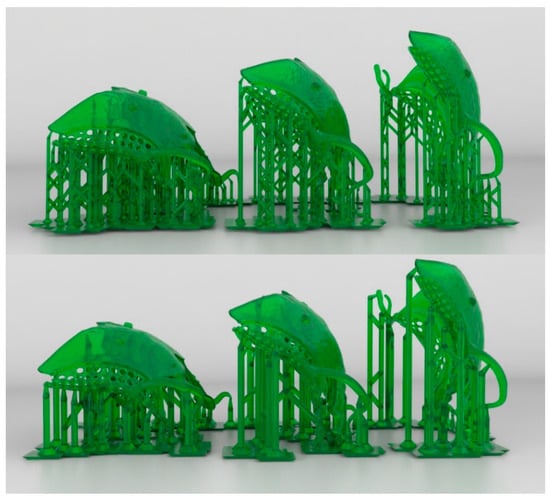 Image representative to the 3D printed parts at different build angles and support thicknesses. The upper three parts for the thin support with 110, 135, and 150-degree angles (from right to left). The lower parts showing same sequence at thick support.